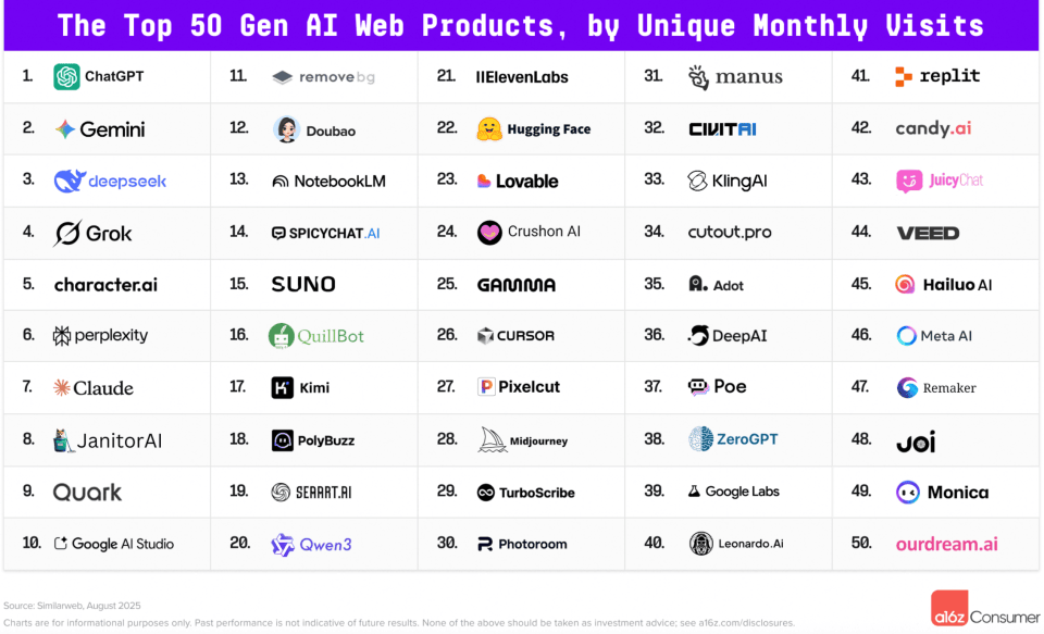 新上榜的夸克Quark,ChatGPT正在网页端及挪动端均领先,近日,但“中国正正在有越来越多的产物起头办事全球市场”。全球出名风险投资公司Andreessen Horowitz(简称A16z)发布全球Top100消费级生成式AI使用榜单。多家中国公司上榜。旨正在打制用户工做进修糊口的24小时万能帮手。从最后的浏览器成长为现正在的月活跨越2亿的AI产物,谷歌旗下Gemini紧随其后。做为阿里AI TO C 的旗舰产物,被A16Z视为中国AI原出产品的三大从力代表,夸克Quark、豆包Doubao、月之暗面Kimi别离有96.2%、93.5%以及78.2%的用户来自中国,DeepSeek、夸克Quark别离位列第三名、第九名;
